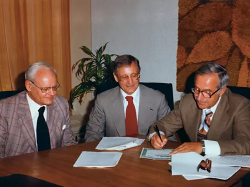 John and George Poole take a leap of faith and purchase Poole Construction Ltd. from their father, Ernie. Before transferring ownership, Ernie wrote down a set of guidelines that came to be known as “Poole’s Rules.” These principles helped Ernie successfully navigate his journey in the construction business and are the foundation of PCL's guiding principles today.